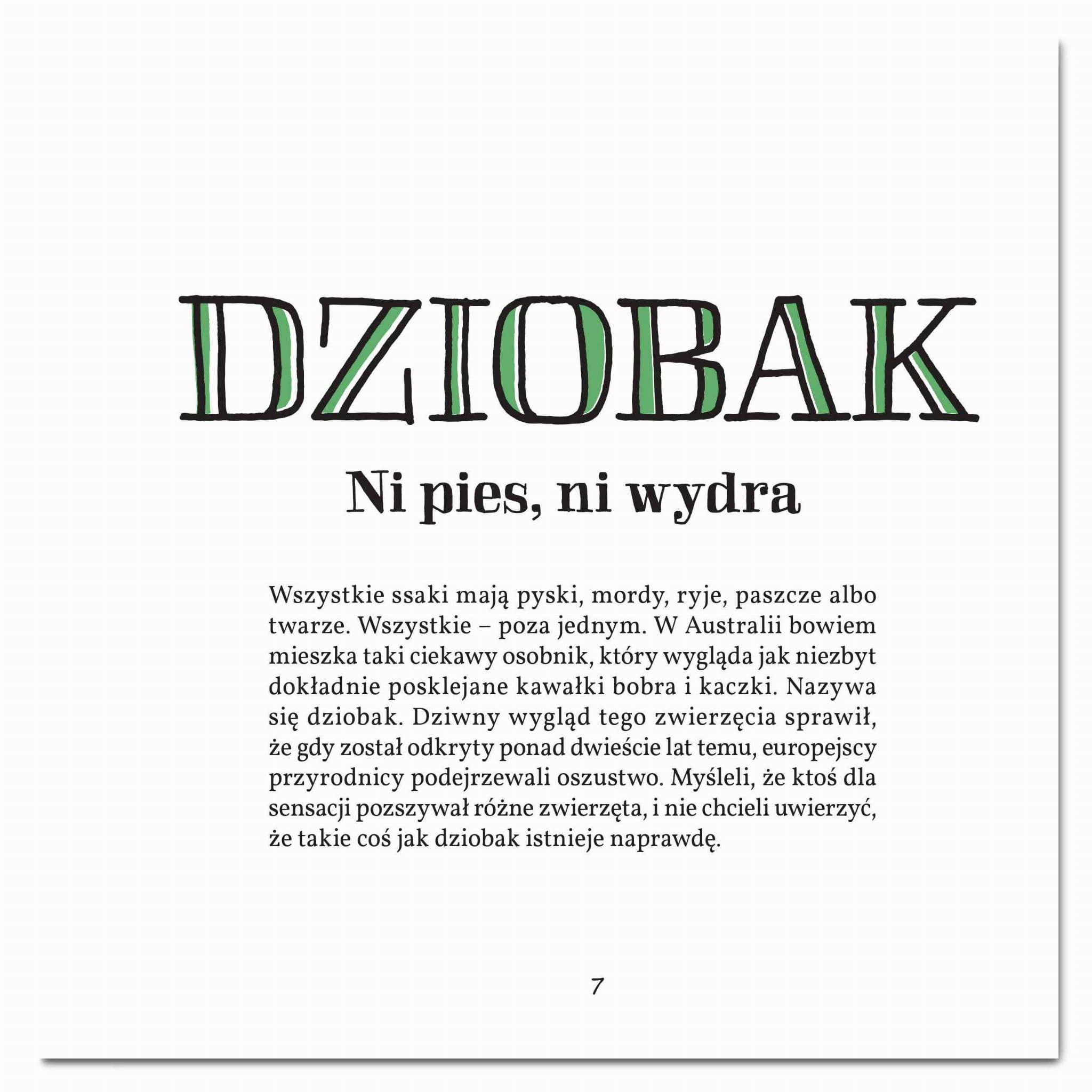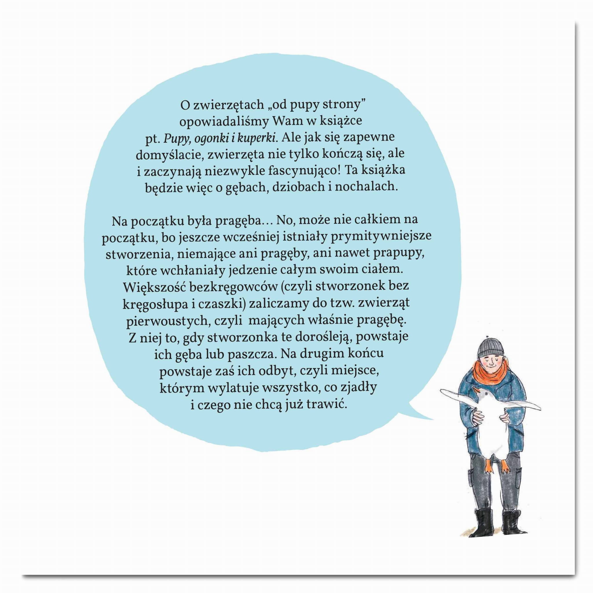 Pełna fascynujących ciekawostek, anegdot i faktów z życia zwierząt. Kontynuacja entuzjastycznie przyjętych „Pup, ogonków i kuperków”. Znajdziecie tu ponad trzydzieści opowieści o gębach, dziobach i nochalach... bo zwierzęta nie tylko kończą się, ale i zaczynają niezwykle intrygująco!