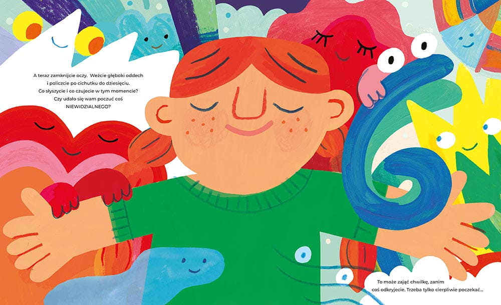 Są takie, które można zobaczyć naszymi zmysłami lub po prostu poczuć w środku. Ilustracje pobudzają wyobraźnię i zachęcają do wspólnych rozmów nad książką. Sama książka wspiera aktywne czytanie, jest w niej sporo pytań do czytelnika, które skłaniają do refleksji. Do zatrzymania się tu i teraz i zastanowienia się nas tym co aktualnie czujemy.