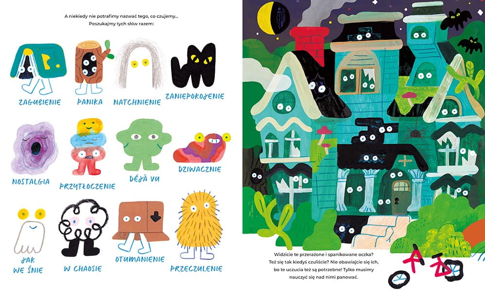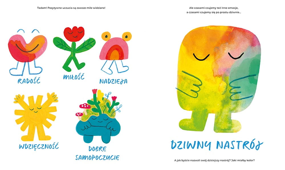 Karty książki, pełne kolorów i ciekawych postaci odkryją przed wami pozytywne uczucia, nastrój miejsca, w którym przebywacie, a także uczucia, które wydają nam się straszne i niepotrzebne.