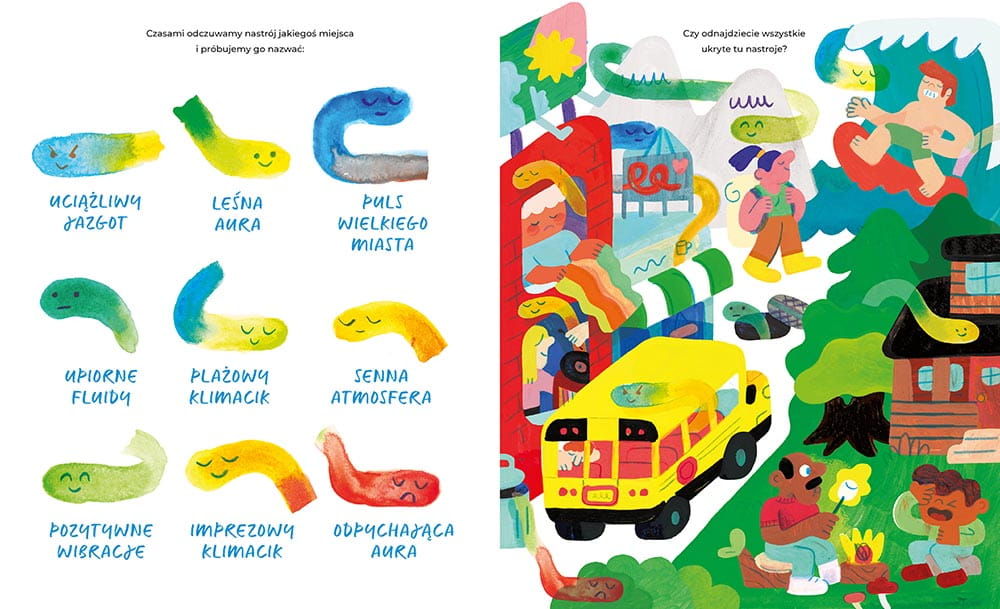 Na przykład leśna aura czy plażowy klimacik. I znowu ilustracja zachęcająca dzieci do odnalezienia ukrytych nastrojów. To wcale nie taka prosta sprawa.