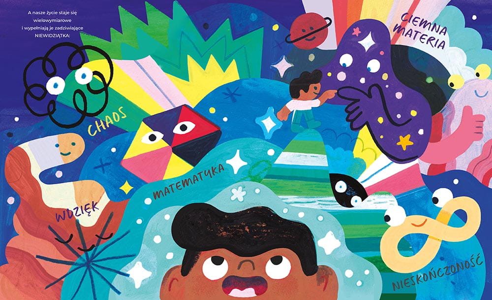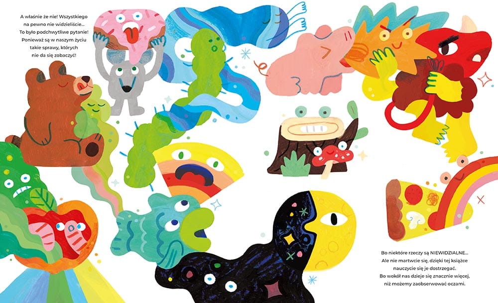 W „Niewidziątkach” tekstu nie jest dużo i stanowi raczej pewne podprowadzenie pod to, co dzieje się w warstwie wizualnej. Sam w sobie zresztą nie jest zbyt angażujący, wystarczający do tego, żeby usiąść wspólnie z kilkulatkiem i poprzyglądać się niewidzialnymi zjawiskom, którym twórcy dali widzialną formę. Autorzy przypatrują się echu i miejscom, gdzie można je spotkać, nadają kształt smakom i zapachom, pokazują nastroje miejsc, emocje losowych bohaterów i abstrakcyjne pojęcia takie jak nieskończoność czy chaos. Niektóre ilustracje aż kłębią się od zanimizowanych zjawisk, których można szukać, które można nazywać i snuć na ich temat swoje własne opowieści.