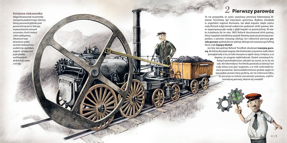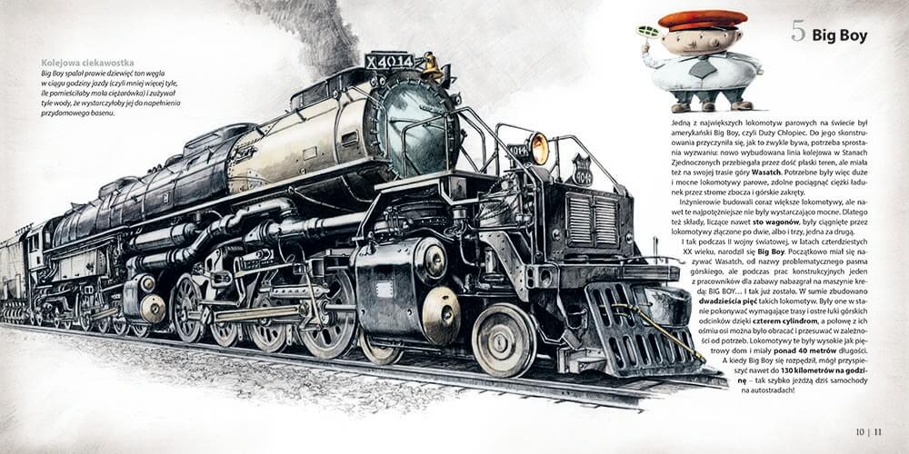 W tej książce poznasz nie tylko historię słynnych lokomotyw (Locomotion No. 1, Rocket, Big Boy), ale też spektakularne trasy (Kolej Transsyberyjska, Orient Express, Aurora Borealis Express) i niezwykłe maszyny szynobusy, pociągi pancerne, towarowe, lokomotywy manewrowe).